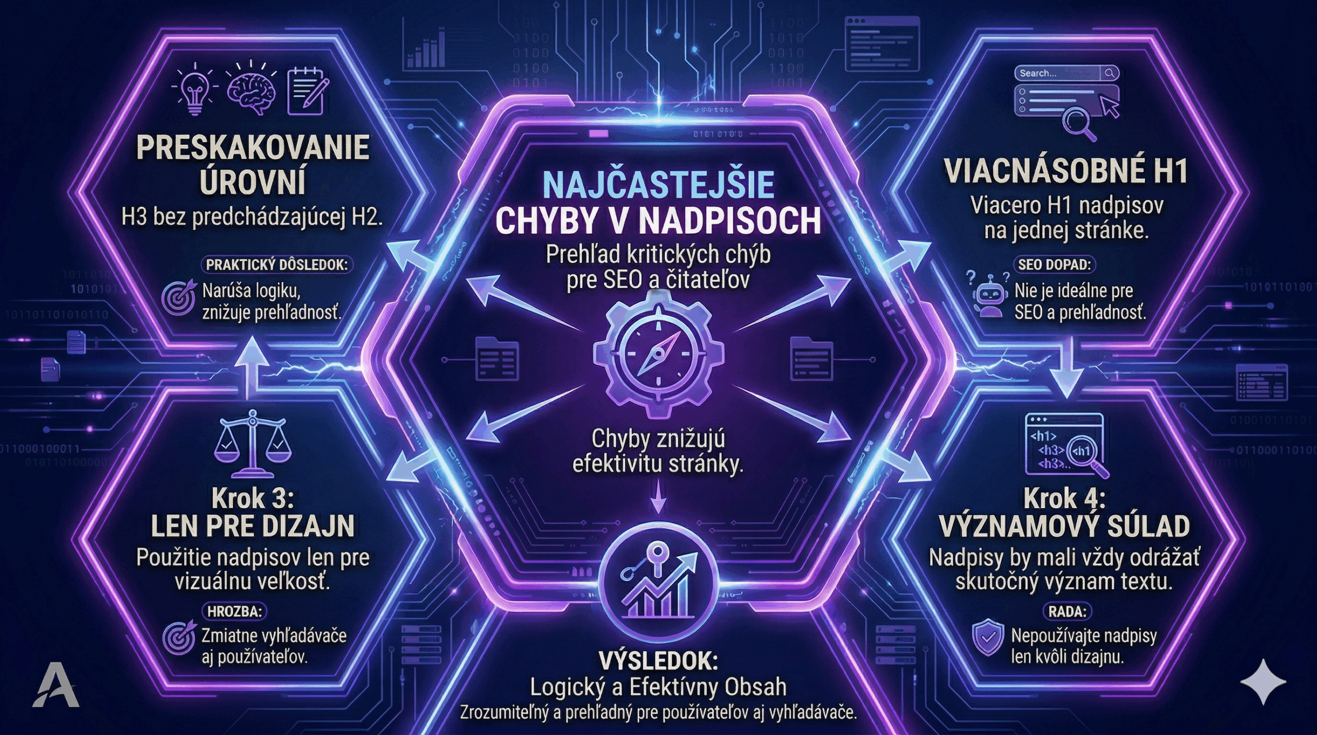 Jednou z najčastejších chýb je preskakovanie úrovní, napríklad použitie H3 bez predchádzajúcej H2. Takýto postup narúša logiku obsahu a znižuje jeho prehľadnosť.